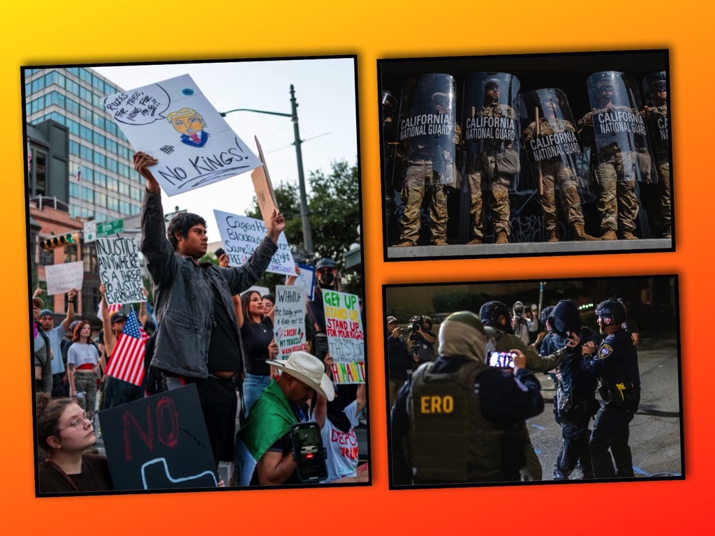 Đợt “No Kings” đầu tiên bùng nổ sau khi Nhà Trắng ký hàng trăm mệnh lệnh hành pháp liên quan quyền quốc tịch theo nơi sinh (birthright citizenship), bảo vệ người chuyển giới, sinh viên biểu tình, các chương trình DEI của liên bang… Tranh cãi nhập cư lên tới đỉnh điểm ở Los Angeles, nơi Tổng thống liên bang hóa Vệ binh Quốc gia California trái với ý kiến Thống đốc Gavin Newsom—động thái bị nhiều chuyên gia cảnh báo là chưa từng có tiền lệ và rủi ro vượt thẩm quyền.