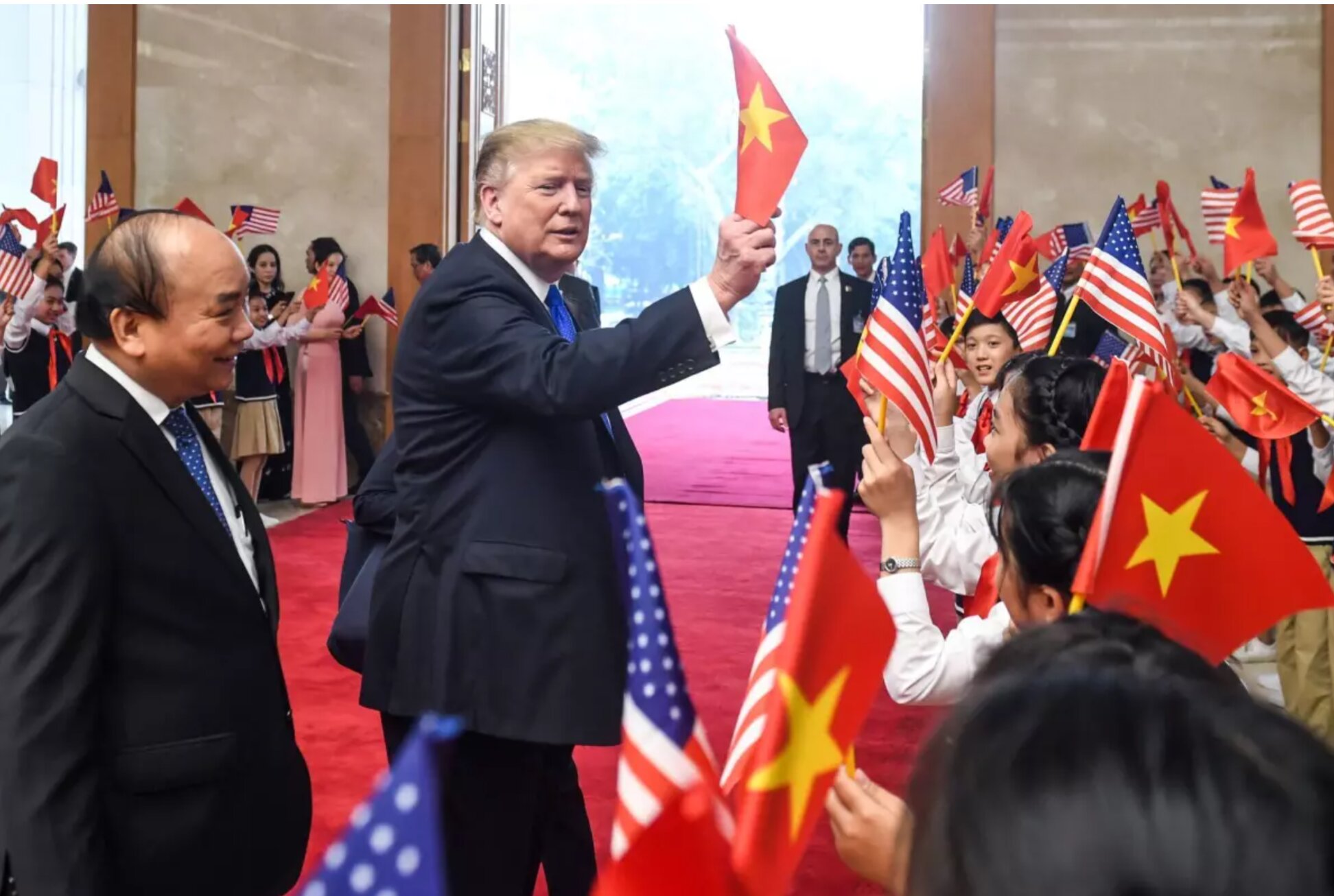 Hình Trump vẩy cờ đỏ sao vàng.