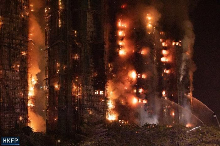 Lính cứu hỏa Hồng Kông nỗ lực dập tắt ngọn lửa đang thiêu rụi nhiều tòa nhà chung cư ở Tai Po tối 26-11. Ảnh: Kelly Ho/HKFP.
