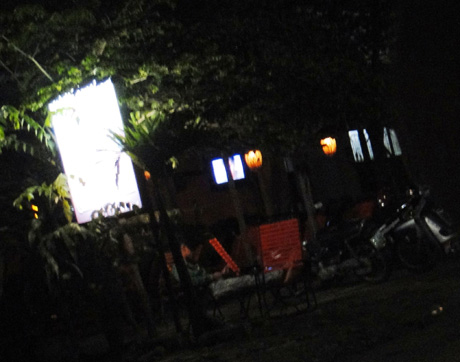 Thoạt nhìn, ở đây có vẻ giống như những quán cà phê sân vườn khác, nhưng người bạn đi cùng với tôi khẳng định ở đây chắc chắn có chiếu phim "tươi mát". Đợi một lúc thì người chủ quán bưng nước ra, anh bạn đi cùng đứng dậy thì thầm với bà chủ điều gì đó. Nghe xong, bà xởi lởi: "Vậy mà không chịu nói sớm, để tốn tiền 2 ly nước ngoài này rồi... Thôi, chịu khó thanh toán đi, rồi dắt xe vào phía trong kia". Thì ra quán cà phê này có 2 khu, khu ngoài tách biệt với khu bên trong và giá thức uống thì gấp đôi khu ngoài. Khi chúng tôi hỏi vì sao lại chênh lệch như vậy thì cô tiếp viên lý giải rất bùi tai là do phụ thu tiền phim. Bên trong là một khoảng sân khá rộng rãi và thoáng mát. Hai chiếc màn hình khá lớn được đặt sát tường và đang chiếu một bộ phim hành động của Mỹ.