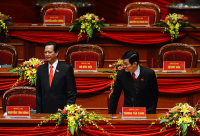 Ông Trương Tấn Sang (phải) và ông Nguyễn Tấn Dũng tại đại hội lần thứ 11 của đảng CSVN. Ðang có những đồn đoán về ‘cuộc chiến ngầm’ giữa hai ông. (Hình: Hoang Dinh Nam/AFP/Getty Images)