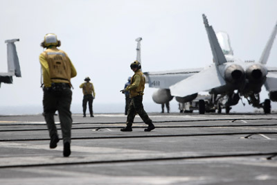 Kỹ thuật viên chuẩn bị cho máy bay đáp xuống hàng không mẫu hạm USS George Washington khi tập trận hành quân ở ngoài khơi Việt Nam. (Hình: AP Photo/Na Son Nguyen)