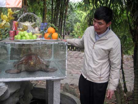 Dẫn chúng tôi tới tham quan nơi đặt xác rùa, người quản lý chỉ vào hai chân sau của “cụ rùa” đã bị gãy sau hai lần “vận động”: “Lần ấy cứ mải lo chuyện cái tủ kính nên tôi cuống cuồng lấy bắng dính trắng dán lại hai chân cho “cụ”. Giờ nhìn lại cũng thấy tính thẩm mỹ… không cao. Mong “cụ” bỏ qua mà không trách phạt tôi”, người đàn ông này cười phân bua.