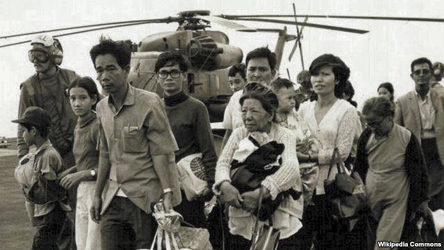 Những người Việt Nam tị nạn đi qua một chiếc tàu Hải quân Mỹ; Operation Frequent Wind là cuộc rút quân cuối cùng ở Sài Gòn ngày 29/4/1975. (Ảnh tư liệu của chính phủ liên bang Mỹ)