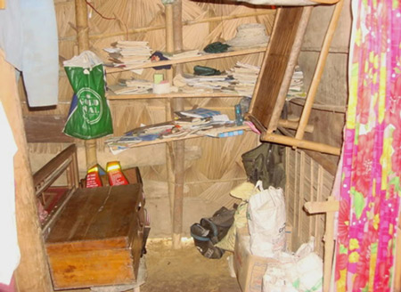 Chúng tôi tìm đến để tìm gặp em Lê Thị Lâm (HS lớp 8, Trường THCS Thanh Thịnh, xã Đồng Văn, huyện Thanh Chương, Nghệ An) trong một căn chòi lợp bằng lá dừa nằm giữa đồng vắng. Mặc dù được nhiều người dân chỉ dẫn tận tình, nhưng chúng tôi vẫn không khỏi bàng hoàng khi chứng kiến tận mắt hoàn cảnh của bốn mẹ con.
