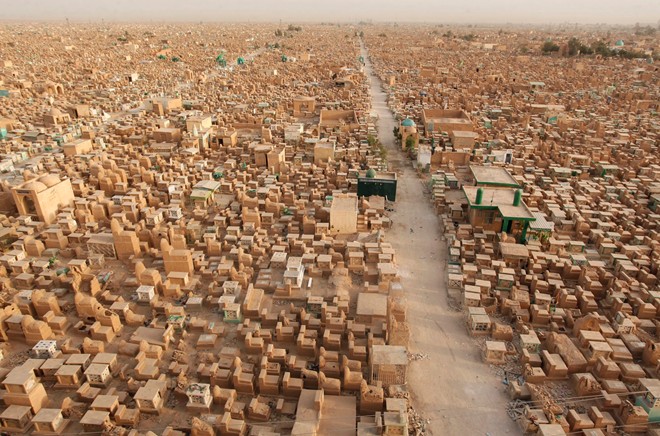 2. “Nghĩa địa cổ đại” Najaf, Iraq: Với những người không tin vào thế giới tâm linh thì việc sống cạnh nghĩa trang khá lý tưởng, yên tĩnh. Nhưng với những người sợ ma thì sống tại Najaf, Iraq đúng là một cơn ác mộng. Thành phố này có Wadi Al-Salam, nghĩa trang lớn nhất thế giới, nơi an nghỉ của hơn 5 triệu người. Việc chôn cất diễn ra hàng ngày trong suốt 1.400 năm qua. Để có một suất đất trong nghĩa trang, người ta phải chi tới 10.000 USD.