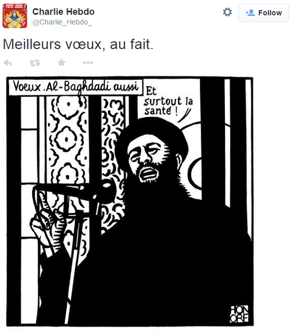 Bức vẽ có h́nh thủ lĩnh tối cao IS Abu Bakr al-Baghdadi cùng một ḍng chú thích khá khó hiểu: "Chúc những điều tốt đẹp nhất sẽ tới. Và gửi tới ông nữa, Al-Baghdadi". Ở đó, Abu Bakr al-Baghdadi đáp lại: "Và đặc biệt là chúc sức khoẻ tốt".