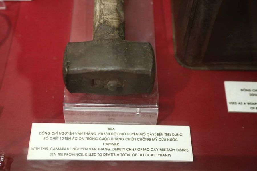 Cây búa dưới đây được chụp ở Bảo tàng Quân đội Việt Nam. Phía dưới kỉ vật có ghi như sau: “BÚA. Đồng chí Nguyễn Văn Thắng, huyện đội phó huyện Mỏ Cày (Bến Tre) dùng bổ chết 10 tên ác ôn trong cuộc kháng chiến chống Mỹ cứu nước”. Ngoài ra, còn có dòng chữ tiếng Anh: “HAMMER. WITH THIS, CAMARADE NGUYEN VAN THANG, DEPUTY CHIEF OF MO CAY MILITARY DISTRIS, BEN TRE PROVINCE, KILLED TO DEATTS A TOTAL OF 10 LOCAL TYRANTS.”