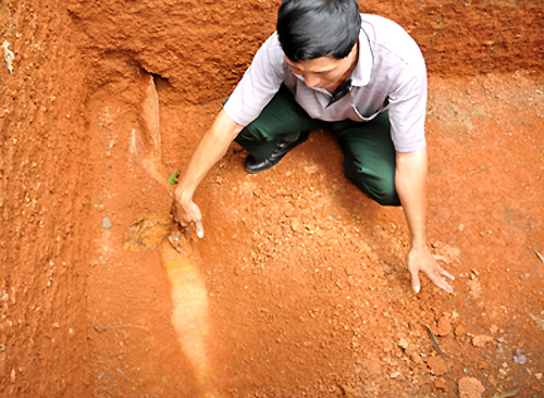 Tại hiện trường, quả bom nằm ngang dưới hố bên cạnh tường nhà anh Khoa, một phần thân bom và đuôi cánh nằm nổi lên mặt đất do được người dân đào lên.