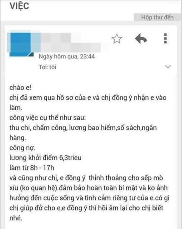 Mới đây, một cô gái tên P.T., là sinh viên năm cuối của trường ĐHQG TP.HCM đã công khai email của người tự xưng là nhà tuyển dụng với nội dung gạ tình trắng trợn. Theo đó, sau khi nộp hồ sơ xin việc ứng tuyển vị trí kế toán cho công ty này, người ứng tuyển đã nhận được email thông báo trúng tuyển từ "nhà tuyển dụng" với nội dung như trên.