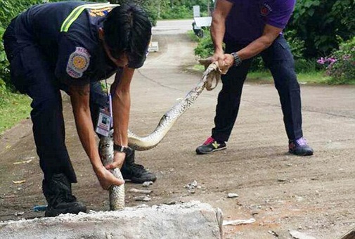 Một con rắn khổng lồ được tìm thấy trong tình trạng đang mắc kẹt trong một cái nắp cống ở Thái Lan. Một người lái xe đã phát hiện ra con rắn và ngay lập tức báo cho cứu hộ, đồng thời đứng bảo bệ con rắn bởi ông lo sợ sẽ có xe chạy qua không may chèn lên người nó.