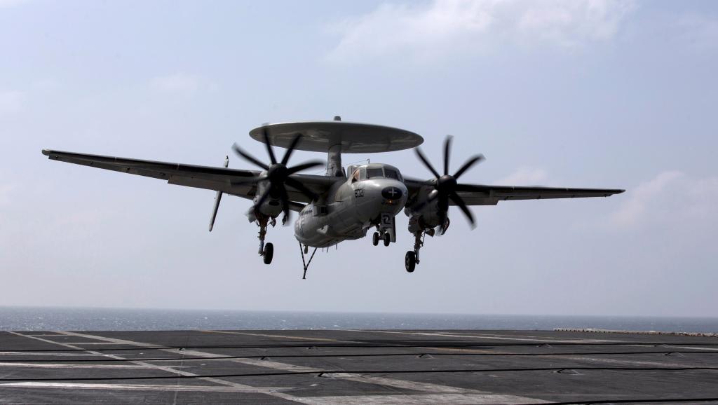 Máy bay trinh sát Northrop Grumman E-2 Hawkeye của hải quân Mỹ hạ cánh xuống tàu sân bay USS George Washington trong lần ghé qua Biển Đông ngày 7/11/2013.