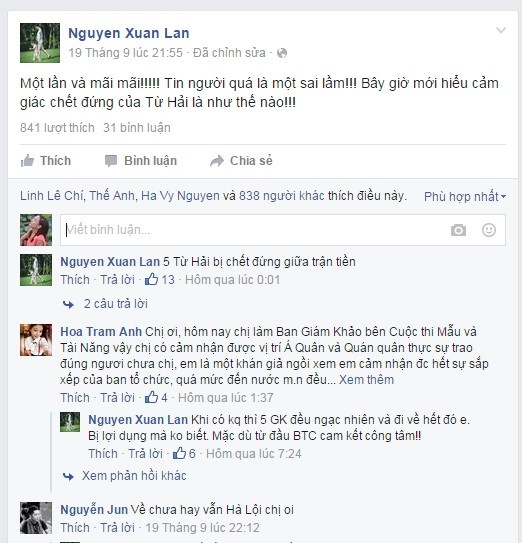 Dòng trạng thái của Xuân Lan thể hiện khi kết quả bình chọn trong Mẫu và tài năng Việt Nam 2015 không công bằngTheo như Xuân Lan chia sẻ, ngay sau khi công bố kết quả, 5 giám khảo đều "chết đứng" vì ngạc nhiên và đi về hết.