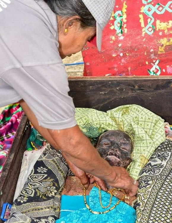 Tập tục 'đánh thức' người đã chết có tại một ngôi làng ở Indonesia, người quá cố được đào lên để mặc quần áo mới. Tập tục 'đánh thức' người đã chết có từ lâu đời tại một ngôi làng ở Indonesia, đây được gọi là nghi lễ Ma'nene - một trong những tập tục truyền thống vô cùng kỳ lạ nhằm tưởng nhớ đến người đã khuất. Với tập tục này, xác ướp người chết được đào lên để mặc quần áo mới.