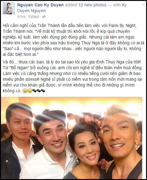 “Hỏi cảm nghĩ của Trấn Thành lần đầu tiên làm việc với Paris By Night, Trấn Thành nói: “Về mặt kỹ thuật thì khỏi nói rồi, ê-kíp quá chuyên nghiệp, kỷ luật, làm việc đúng giờ đúng giấc. Nhưng cái làm em ngạc nhiên khi bước vào phía sau hậu trường Thúy Nga là ở đây không có ai là “sao” cả. Mọi người đều như nhau. Việc người nào người lấy lo, không ai đặc biệt hơn ai”.