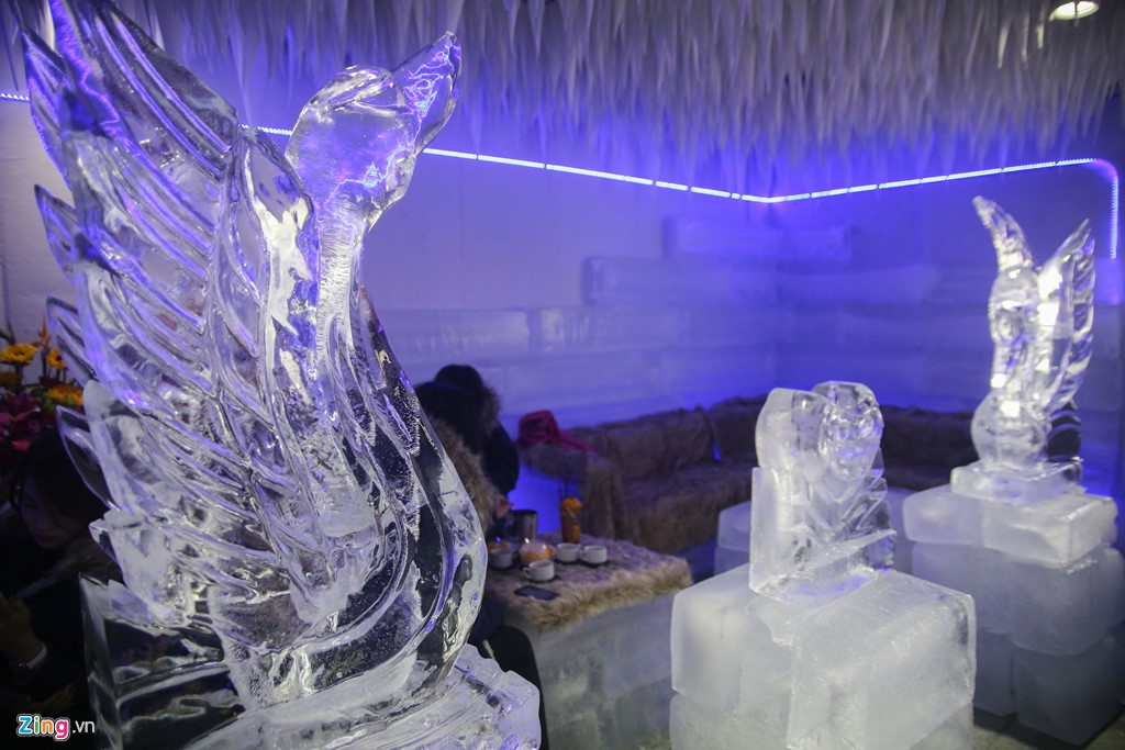 Bên trong quán cà phê băng giá có thiết kế nhiều mô hình bằng băng tạo nên không gian khá đẹp.