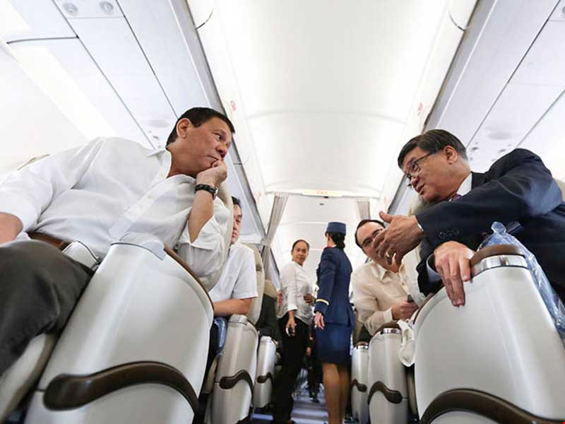 Ông Duterte trên máy bay bay đến Việt Nam ngày 28-9. Ảnh: PHILSTAR