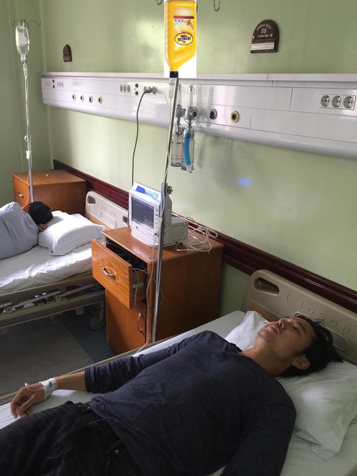 Trên trang cá nhân mới đây, Vũ Hoàng Việt bất ngờ chia sẻ hình ảnh anh đang nằm trong bệnh viện kèm dòng chú thích "Kiệt sức em vào viện truyền nước biển"