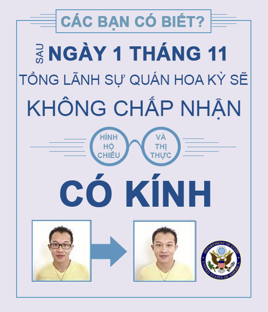 Khi bạn chụp hình làm hộ chiếu hoặc thị thực, vui lòng không đeo kính. Bắt đầu từ ngày 1/11/2016, bạn không được đeo kính khi chụp hình thị thực và hộ chiếu Mỹ. Để biết thêm thông tin, hãy truy cập Nonimmigrant Visa, Immigrant Visa, và Passport trên trang web của Phái đoàn Ngoại giao Hoa Kỳ. vn.usembassy.gov