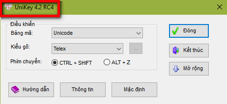 If you are using Windows 8 and above, you will need this latest UniKey 4.2 RC4. For Windows 7 and below, if this version is not working well, you can use the older UniKey 4.0 RC2.
