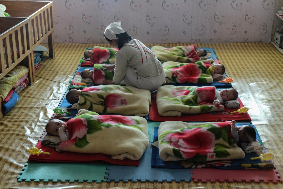 Một y tá chăm sóc các bé sơ sinh trong một trại trẻ mồ côi ở Nampo