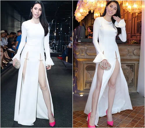 Trà Ngọc Hằng khoe trọn đôi chân thon dài, vóc dáng gợi cảm với đầm xẻ cao, cắt đôi vạt trước. Tuy nhiên, người đẹp nhận được không ít chỉ trích.