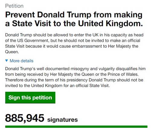 Kiến nghị ngăn Tổng thống Mỹ Donald Trump thăm chính thức Anh đạt được gần 900.000 chữ ký ủng hộ. Ảnh chụp màn hình.