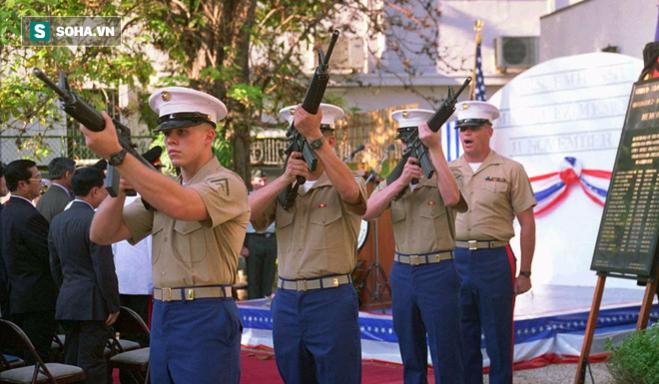 Lính thủy đánh bộ Mỹ từ căn cứ Okinawa tham dự một lễ kỷ niệm của người Mỹ ở thủ đô Phnom Penh, Campuchia. (Ảnh: AP)