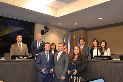 Hàng đầu từ bên trái là ông Jamison Power, Thị Trưởng Steven Jones và vợ ông Jamison. Hàng đưng phía sau là các Nghị Viên HĐTP Garden Grove.