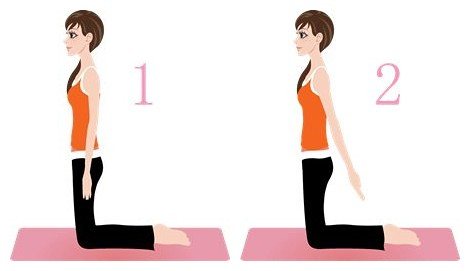 Quỳ gối, lưng thẳng, hai chân tách ra rộng bằng vai, cánh tay thả lỏng tự nhiên, lòng bàn tay hướng ra sau.
