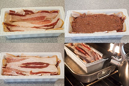 - Lót một lớp thịt hun khói xuống đáy và viền khuôn, đổ hỗn hợp thịt và gan vào và phủ thêm một lớp thịt hun khói nữa lên trên.