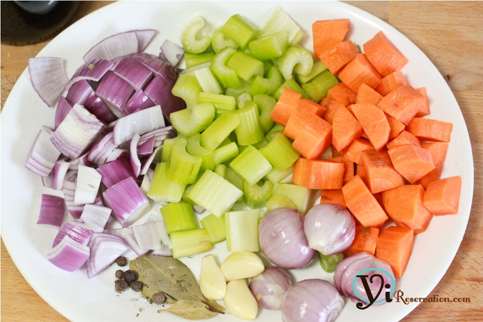 Thêm đuôi bò vào lại cho nồi. Nhẹ nhàng đảo đều với cà rốt và hành tây. Thêm rau cần tây, lá nguyệt quế, tiêu Giamaica, cỏ xạ hương, tỏi, hành khô.