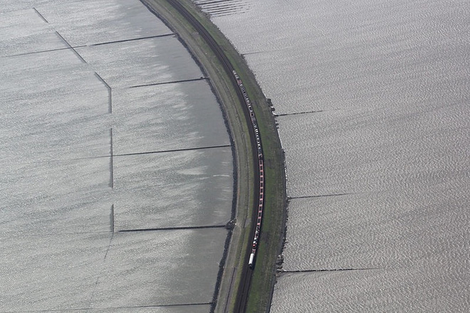 Trong 4 năm ấy, người Đức đã đưa hơn 3 triệu mét khối cát và đất sét, cùng 120 tấn đá từ đất liền ra biển để xây 11km đập ngăn biển, sau đó đặt đường ray trên đó.