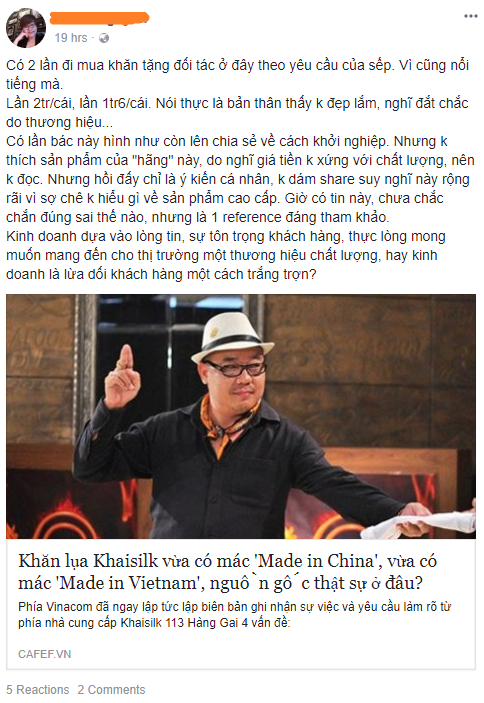 Sự việc lần này khiến người dùng mạng xã hội bày tỏ hoài nghi về chất lượng khăn cao cấp của Khaisilk nói riêng và sự trung thực trong kinh doanh của nhiều doanh nghiệp Việt nói chung.