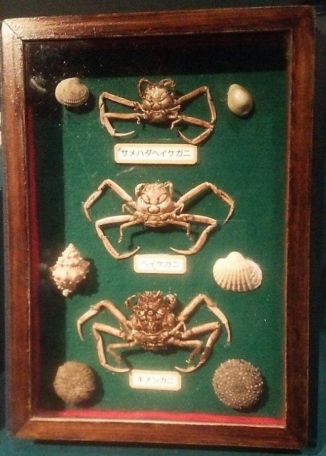 Vietbf.com - Hình ảnh khuôn mặt người có trên vỏ của loài cua Heikegani hay Heike, vì loài cua này có khuôn mặt lúc giận dữ của những chiến binh Samurai đã bị đánh bại trong cuộc chiến giành ngai vàng năm 1185, cho nên coi chúng như loài hiện thân của các chiến binh của gia tộc Heike.