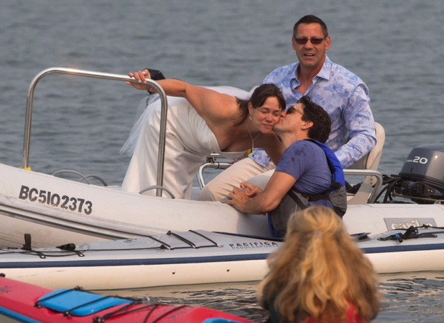 Ông Trudeau thân thiện giao lưu với cặp đôi đang làm đám cưới khi đang chèo thuyền Kayak (Ảnh: Adam/ Twitter)