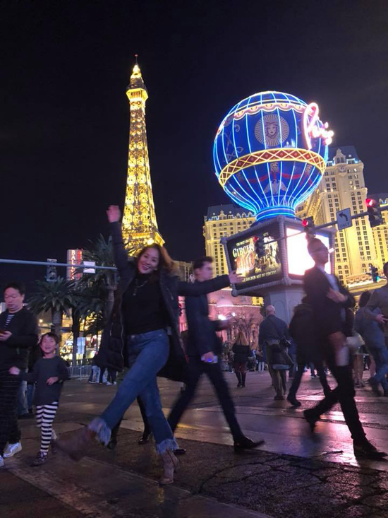 Khánh Thi để lộ vòng hai lùm lùm khi chia sẻ hình ảnh đi du lịch ở Mỹ.