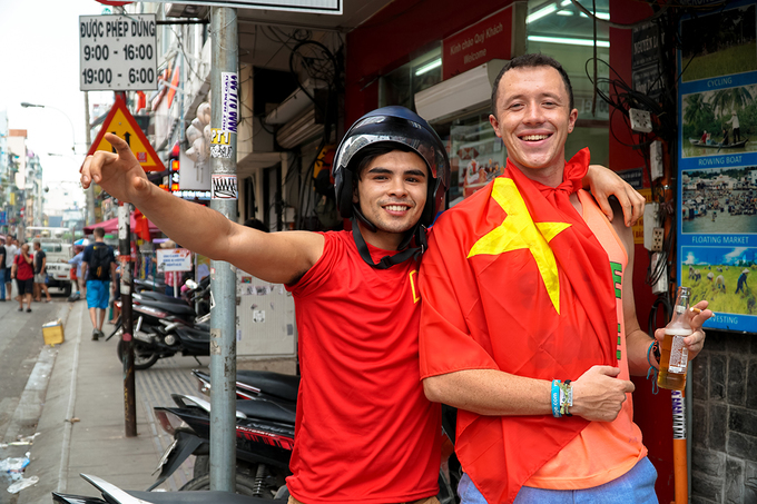 Tại phố Tây Bùi Viện, nhiều du khách đă mặc sẵn áo Việt Nam trong tâm thế sẽ ăn mừng tại đây.