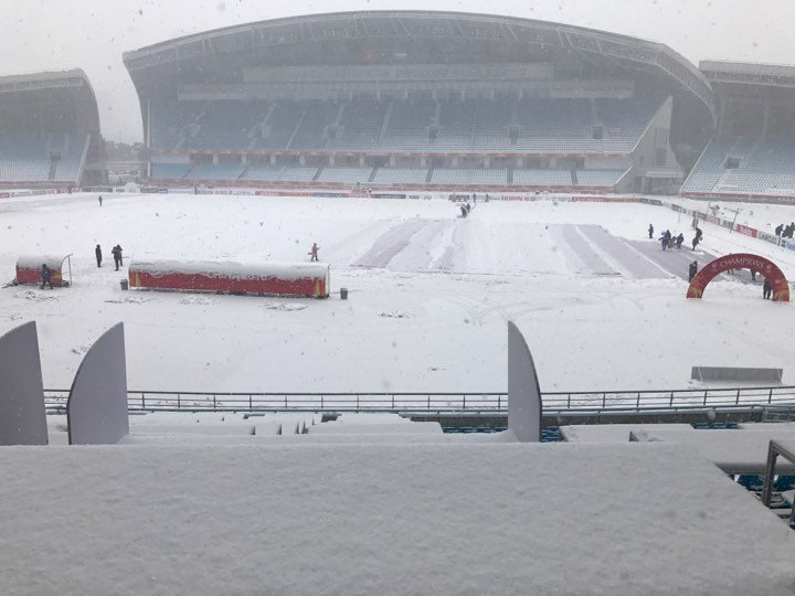 Tuyết quá dày khiến t́nh trạng sân không thể thi đấu nổi. Trọng tài tạm cho trận đấu dừng lại để dọn tuyết.