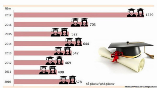 Căn nguyên 'bùng nổ' giáo sư. Trong số giáo sư, phó giáo sư được 'phong hàm', không ít người chưa hề giảng dạy đại học và không có các công tŕnh nghiên cứu khoa học thực sự. Trong đợt xét công nhận chức danh giáo sư (GS) và phó giáo sư (PGS) năm 2016, số người được công nhận lên tới 703 (bao gồm 65 GS và 638 PGS) đă làm xôn xao dư luận xă hội. Nhưng số được công nhận của năm 2017 c̣n vượt xa hơn thế với 1.226 vị được trao giấy chứng nhận, khiến dư luận lại bị "chấn động" hơn nữa.