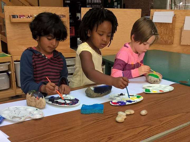 Trẻ em tại trường tư thục Brightworks ở thành phố San Francisco đang tập tô màu bằng dụng cụ vẽ.