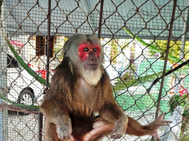 BẾN TRE - Bà Nguyễn Thị Bé Thi, ngụ thị trấn Giồng Trôm, đã bàn giao mộn con khỉ mặt đỏ, tên khoa học Macacaarctoides, cho nhà chức trách sau 17 năm nuôi trong nhà.
