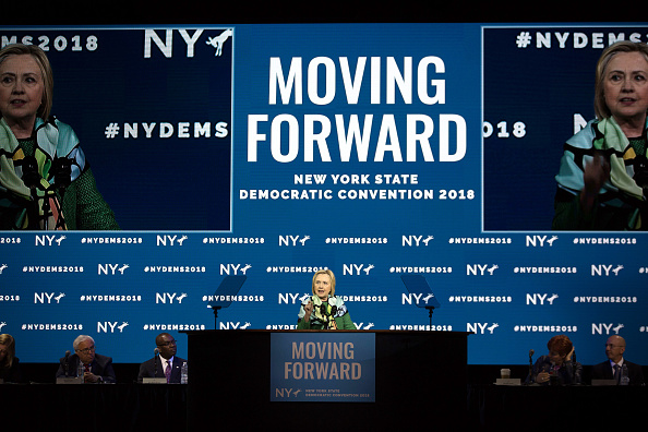 Bà Hillary Clinton đọc diễn văn tại Đại Hội Đảng Dân Chủ Tiểu Bang New York, được tổ chức ngày 23 tháng 5, 2018 tại trường Hofstra University ở thị xã Hempstead. Bà đã vận động cho cuộc tái tranh cử của Thống Đốc Andrew Cuomo. (Kevin Hagen/Getty Images)