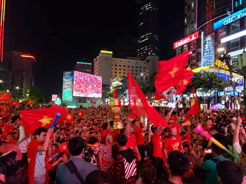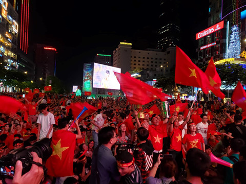 Một màu đỏ rực trên phố đi bộ Nguyễn Huệ ở TP.HCM. Hàng ngàn cổ động viên như vỡ oà khi đội tuyển Việt Nam ghi bàn trên sân Bukit Jalil ở lượt đi chung kết AFF Cup 2018.