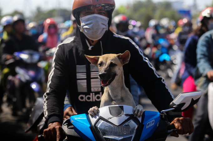 Vợ chồng anh Tùng (Sóc Trăng) mang theo cún cưng về quê ăn Tết do không có người trông coi. "Tôi đi từ sáng sớm để còn kịp nghỉ ngơi lấy sức đi làm. Lúc về quê khá nhàn nhưng chặng đường trở lại thành phố gian nan quá. Xe gần như đứng im trên đường giữa trưa nắng gắt, cứ vài chặng lại dừng mua nước cho người và chó uống", anh than thở.
