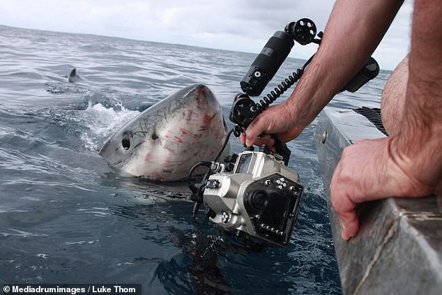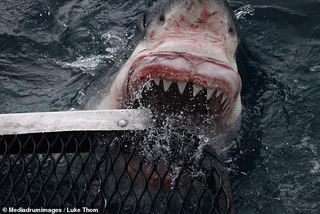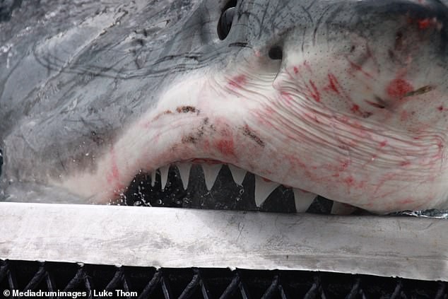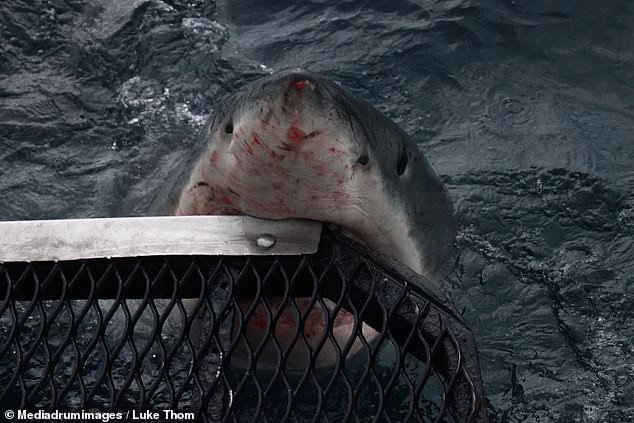 Cá mập ngoạm chặt lồng sắt, may thay Luke Thom đã rút vào an toàn