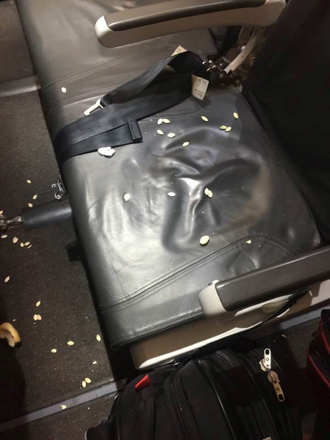 Cũng chuyến bay đó, ngồi hàng ghế phía trước là một phụ nữ trung niên, vừa ổn định chỗ ngồi là chị lôi bịch hạt bí ra ăn. Hậu quả khi chị đứng dậy thì vỏ hạt bí vương vãi từ trên ghế xuống sàn. Sau khi phủi hết vỏ còn vương trên quần áo xuống ghế, chị còn tiện tay vứt luôn chiếc khăn giấy ướt xuống sàn (!).