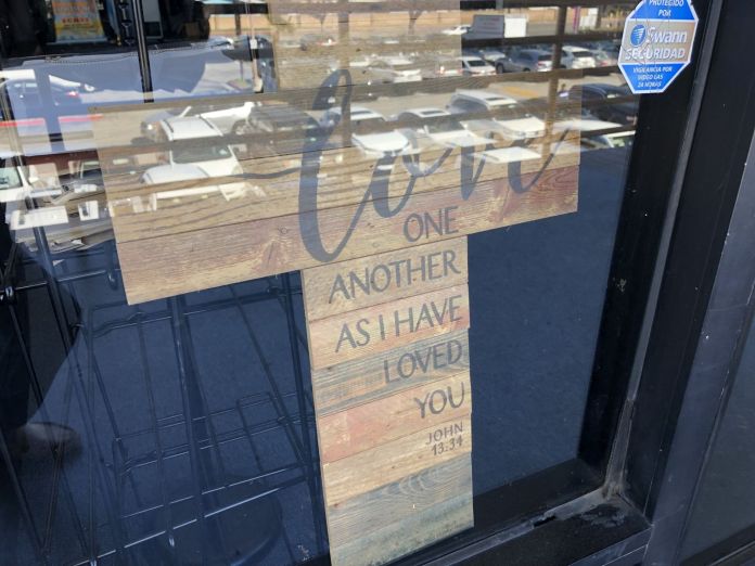 Cây Thánh Giá có một câu nói trong Kinh Thánh, để ngay mặt tiền của CHS. (Hình: Đỗ Dzũng/Người Việt)
