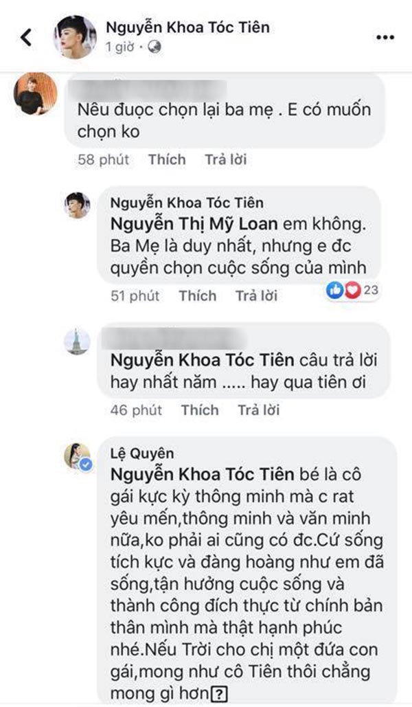 Một tài khoản tên M.L đặt câu hỏi: "Nếu được chọn lại ba mẹ. Em có muốn chọn không?", ngay lập tức Tóc Tiên phản hồi lại rằng: "Em không. Ba mẹ là duy nhất, nhưng em được quyền chọn cuộc sống của mình".