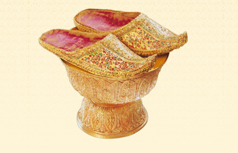 Trong lễ lên ngôi, một tu sĩ Bà La Môn sẽ giới thiệu Nhà Vua với 5 bảo vật Hoàng gia, đồng thời đặt đôi hài vào chân Vua. Đôi hài thể hiện phần mặt đất dưới chân núi Meru – nơi ở của thần Indra.
